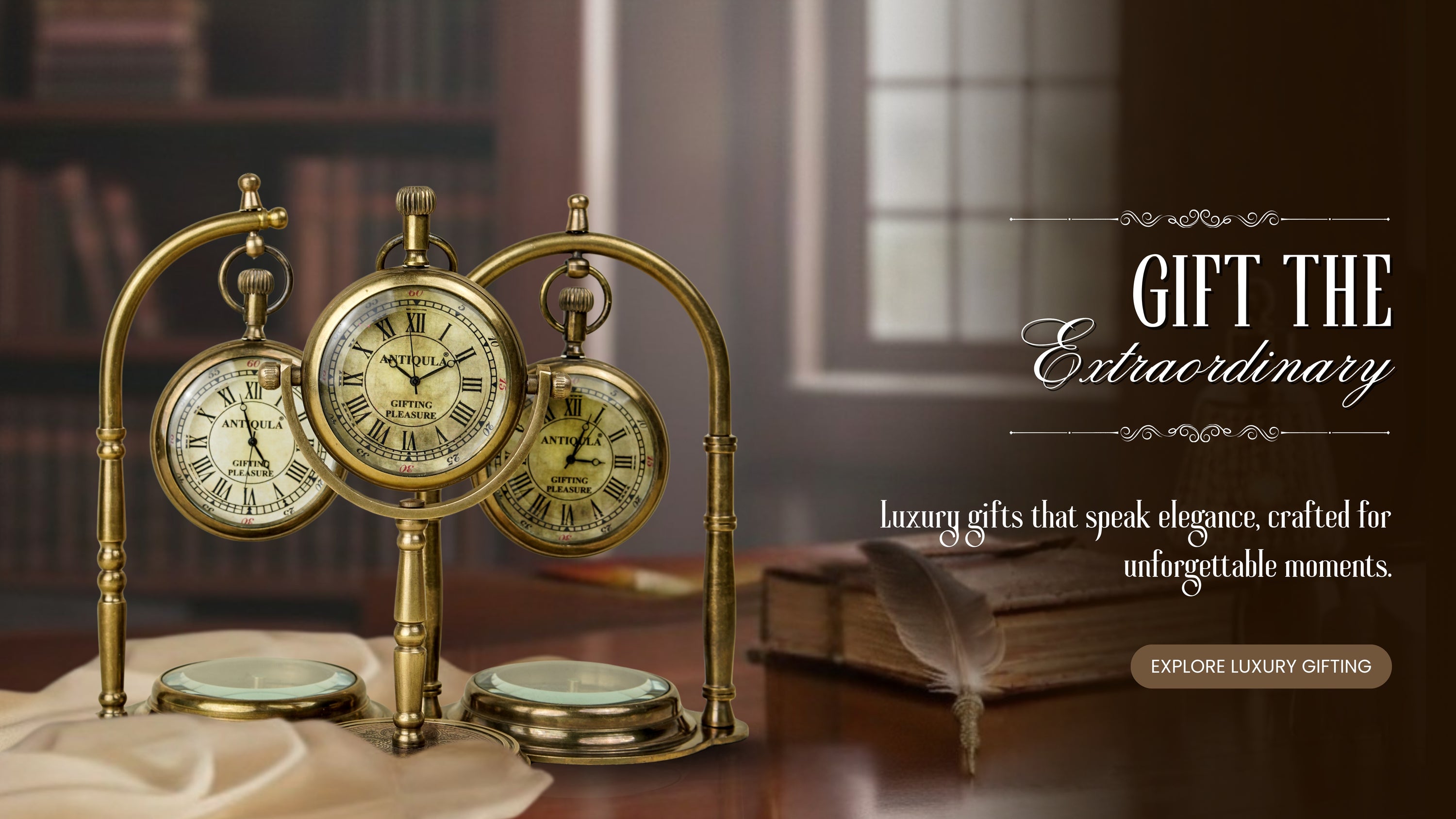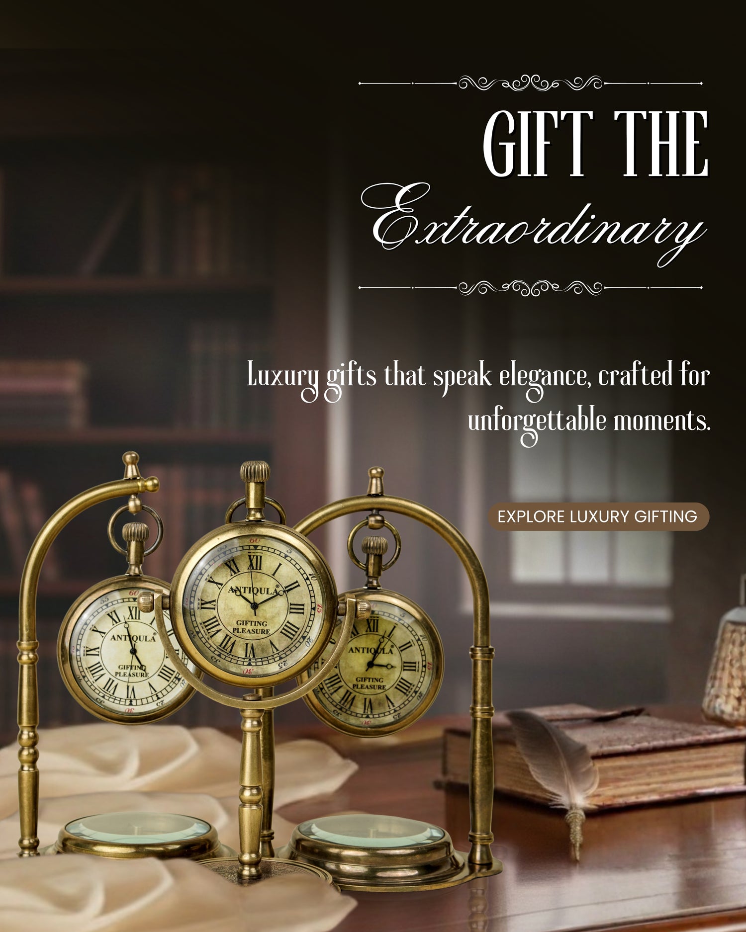 Curate exceptional gifts for clients, executives, and teams with Antiqula's handcrafted brass table clocks and celestial globes. Each piece arrives in premium packaging, ready to inspire and delight.